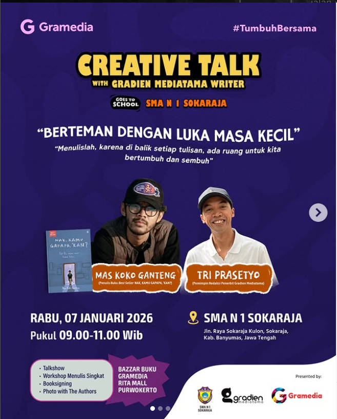 Rabu, 7 Januari 2026 SMA Negeri 1 Sokaraja bekerja sama dengan Gramedia Rita Mall Purwokerto dan penerbit Gradien Mediatama. Dengan tema “Berteman dengan Luka Masa Kecil” . Menghadirkan penulis Mas Koko Ganteng yang bukunya sudah best seller “Nak, Kamu Gapapa Kan ?. Ini Sebagai bentuk untuk meningkatkan literasi para murid dan mengembangkan minat baca dan menulis […]