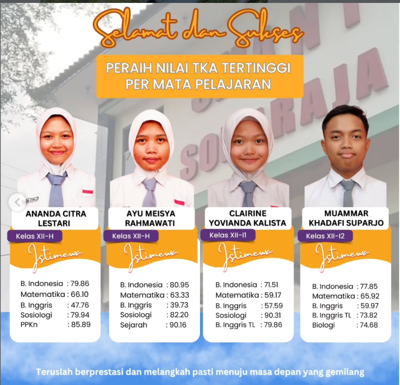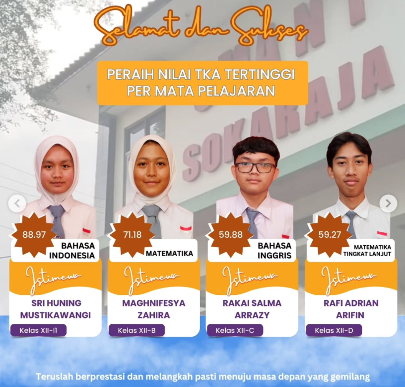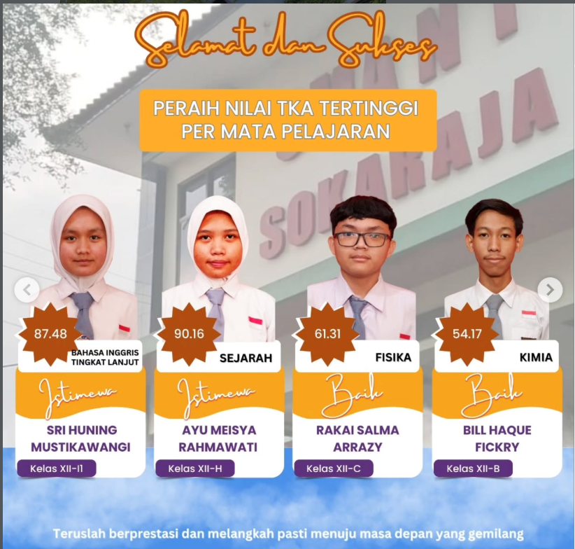 Selamat kepada peraih nilai TKA tertinggi di SMA Negeri 1 Sokaraja